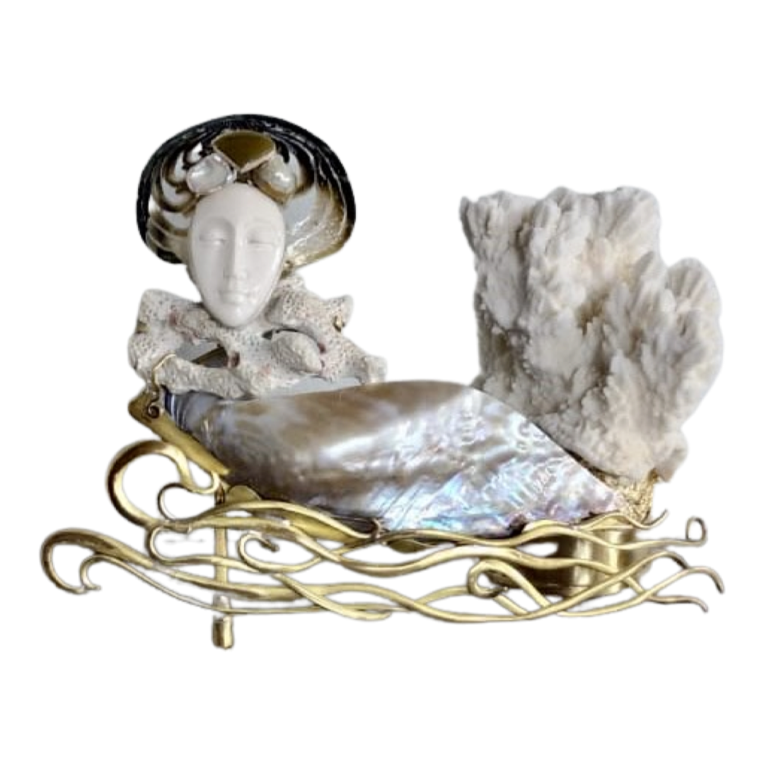 Curated with shells, white coral, and freshwater pearl, sulfur stone, and carved shells.
