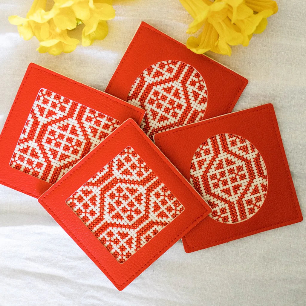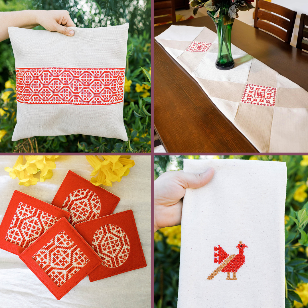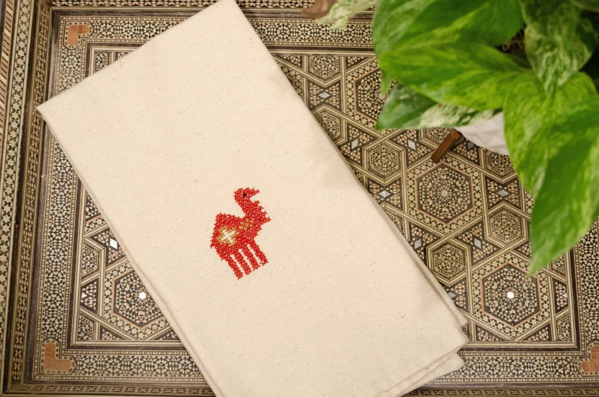 The Home Bundle features the Palestinian Red Pillow, Coasters (set of 2), Red Table Runner, and Tea Towel (Peacock or Camel).